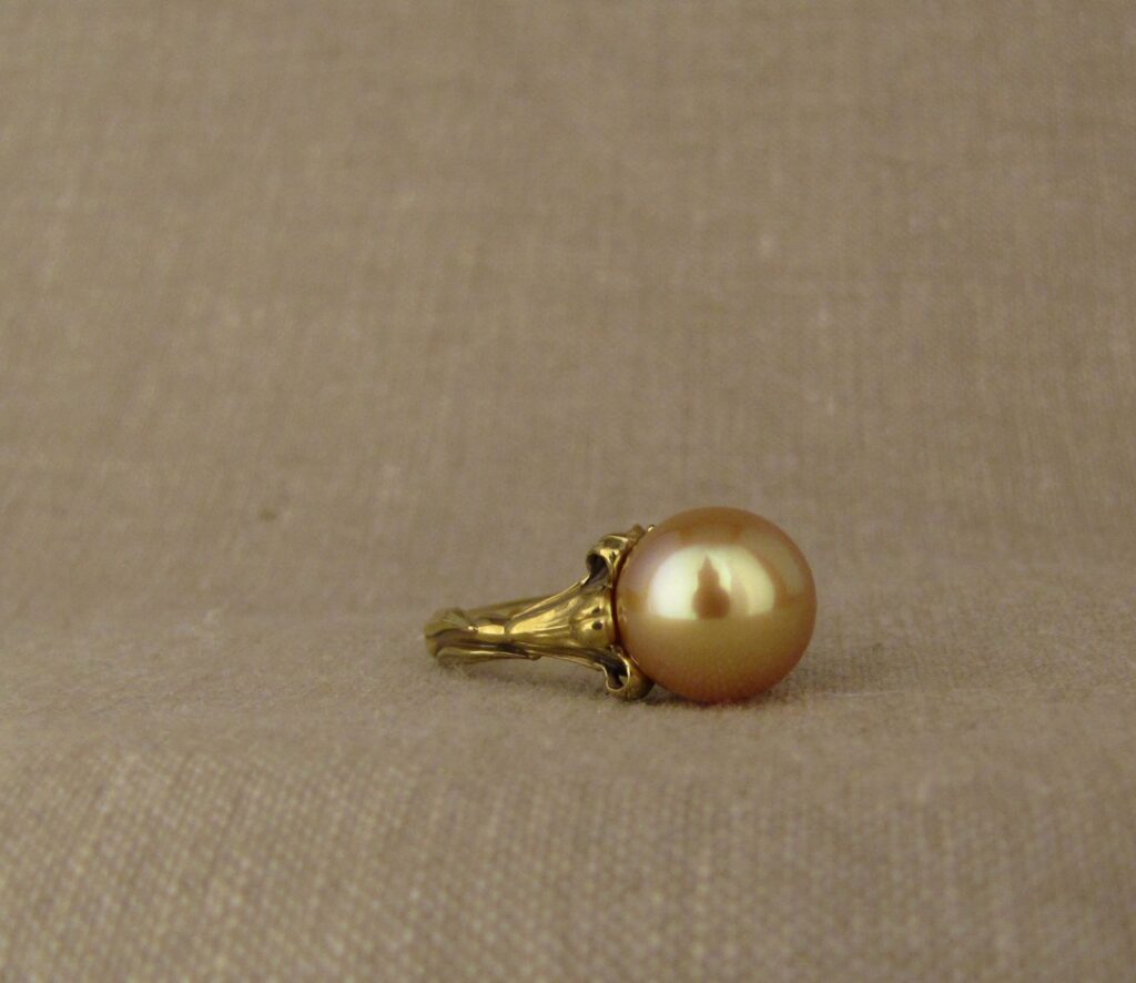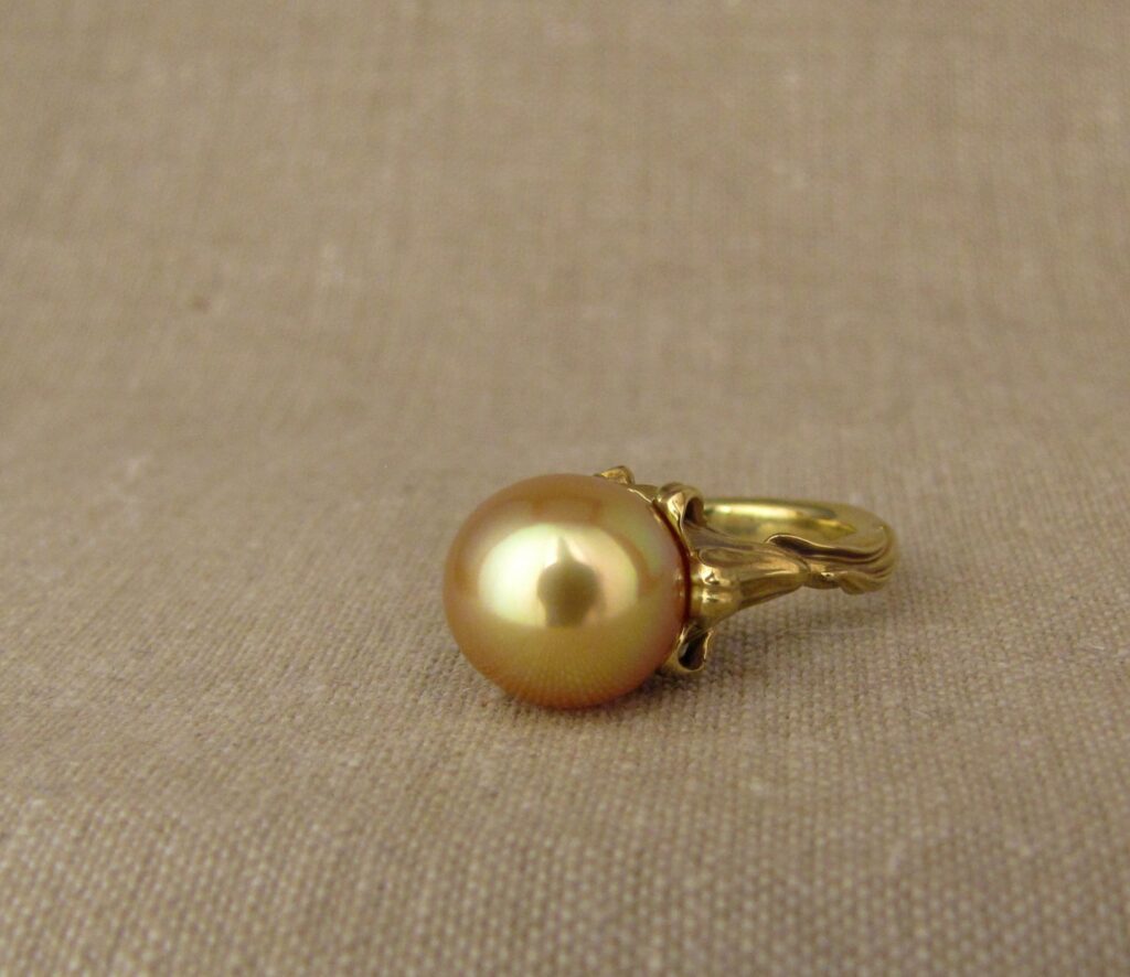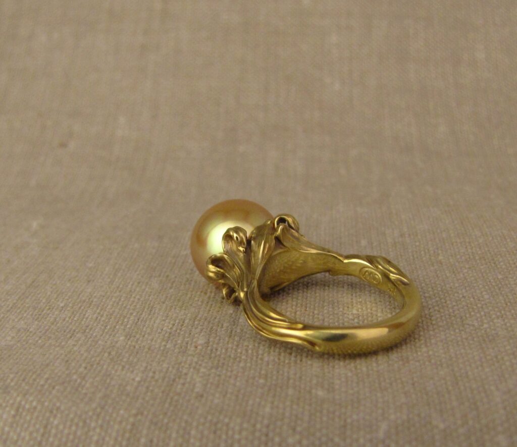 This gorgeous pearl is a natural color from the warm tropical waters around Indonesia and the Philippines. The lily motif is specifically a Taiwan (Formosan) Lily, 18K yellow gold. This ring turned out so nicely!