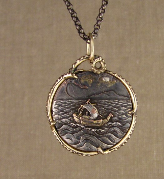Here is the second iteration of the pendant mounting for the Japanese Shakudo medallions. This time I did a tentacle-y motif holding this second medallion.