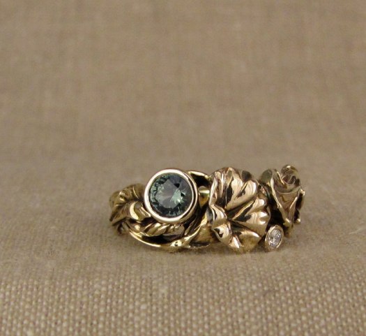 Solitaire carved with Lupine flower detail. Set with an oval green sapphire, 14K yellow gold. Many more photos after the click!