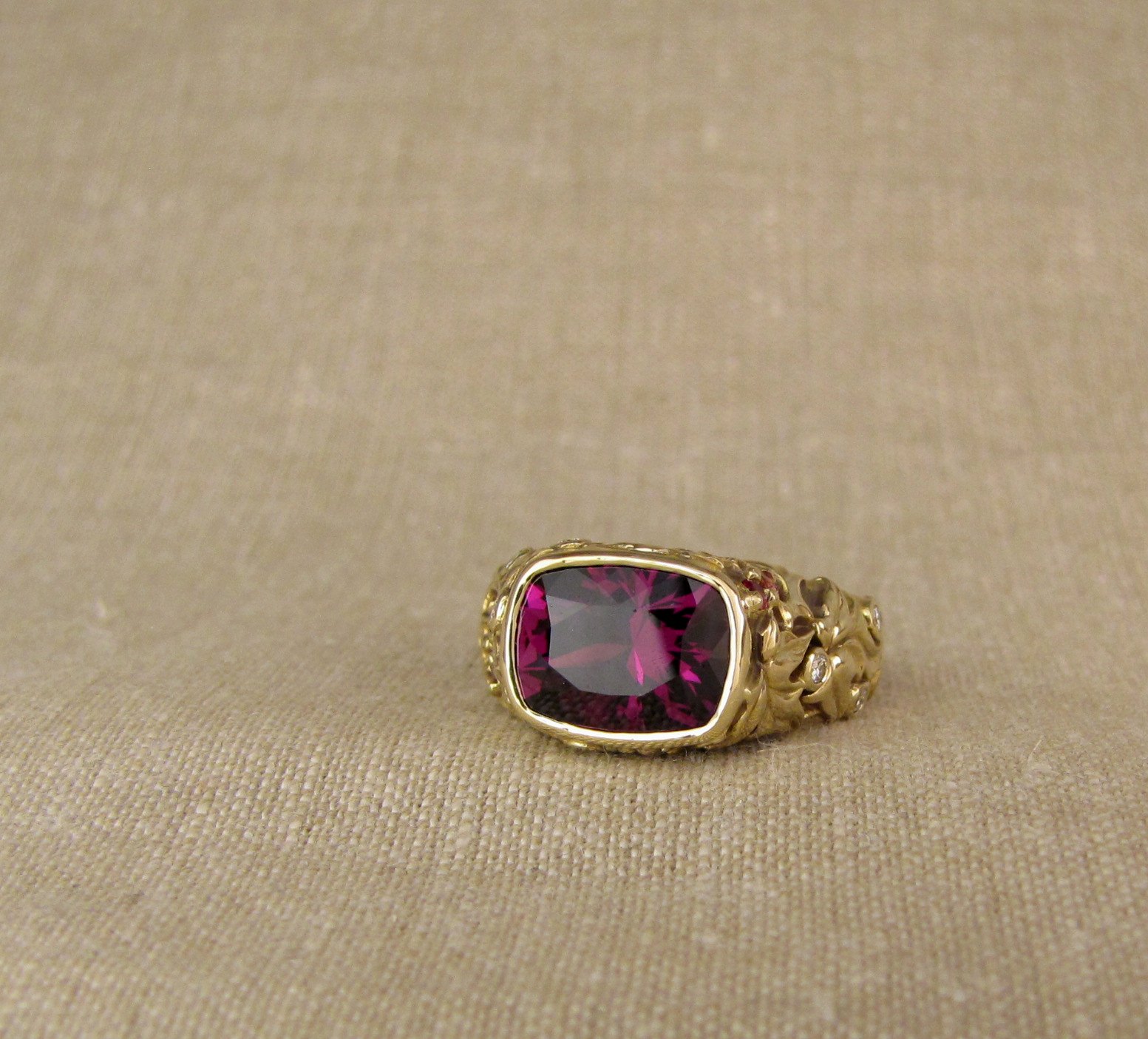 This ring has a kind of wintry romantic vibe: a deep berry-colored garnet surrounded by ivy and holly leaves with a pine bough + seedcone on one side. Diamond dewdrops are scattered throughout, plus a couple of little ‘berry’ clusters of garnets (anthill, rhodolite, ‘grape’ garnets). 18K yellow gold.